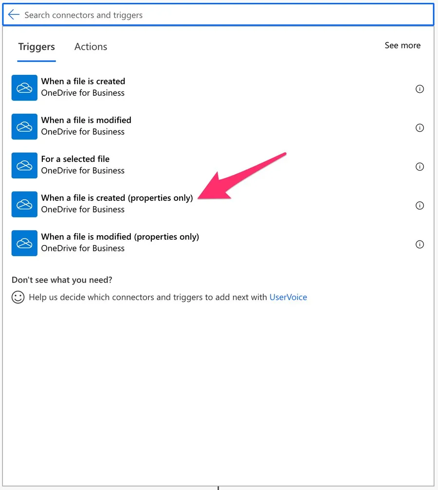 You can search for the OneDrive for Business “When a file is created (properties only)” trigger or click “OneDrive for Business”.