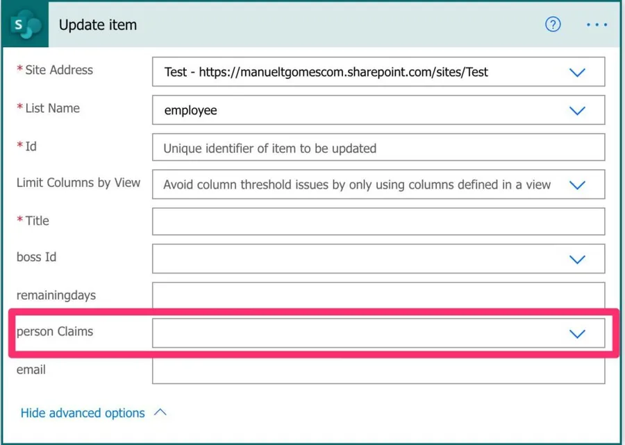 If you use other actions, like SharePoint’s “Update item” action, you will notice that they have, what is called, the “Claims” for a person and not the email as in the “create a task” action.