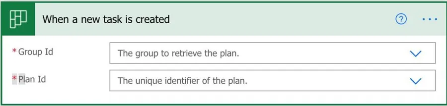 In the case of the Planner “when a new task is created” trigger, we need to define the following: