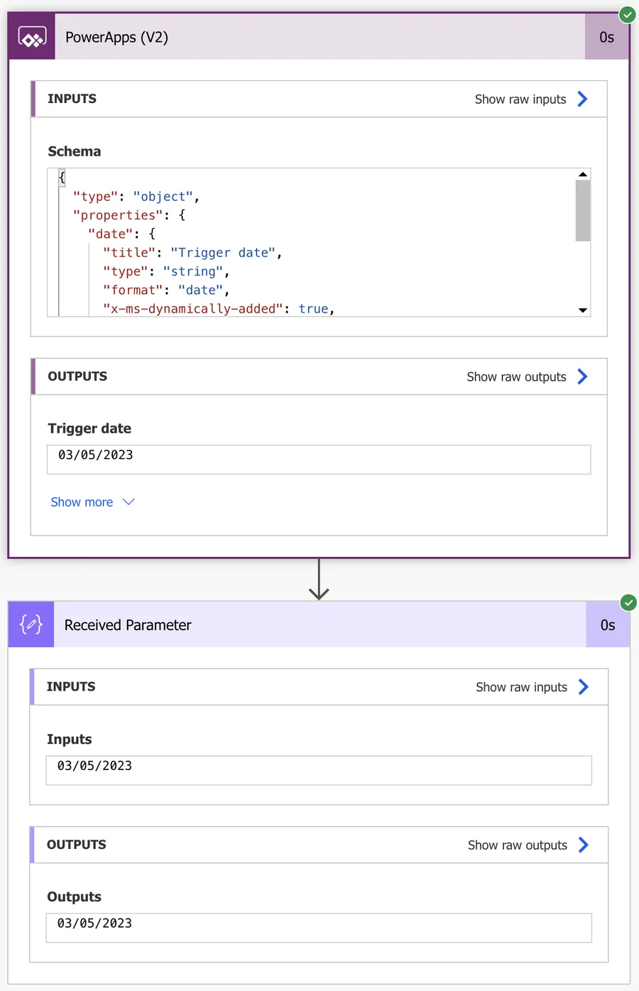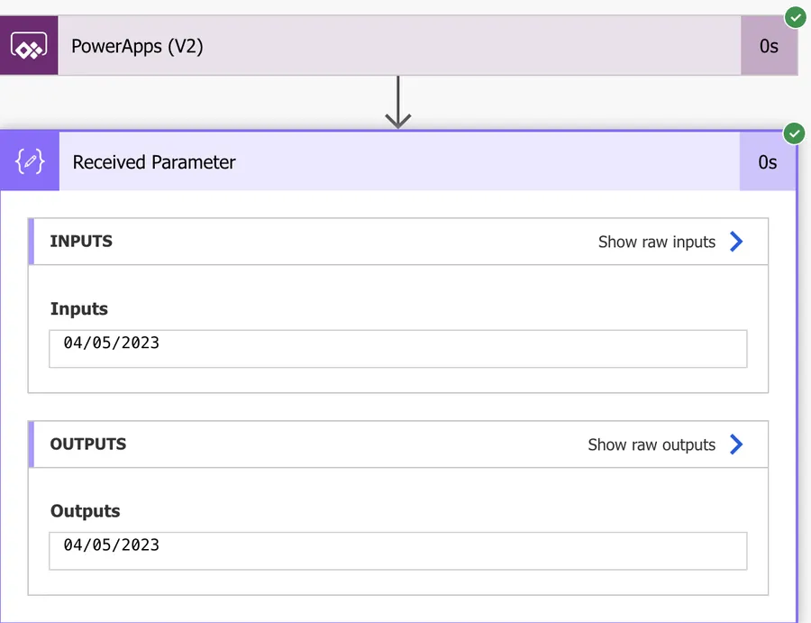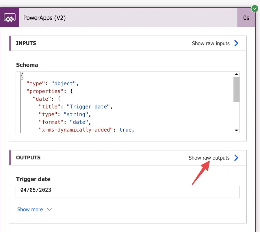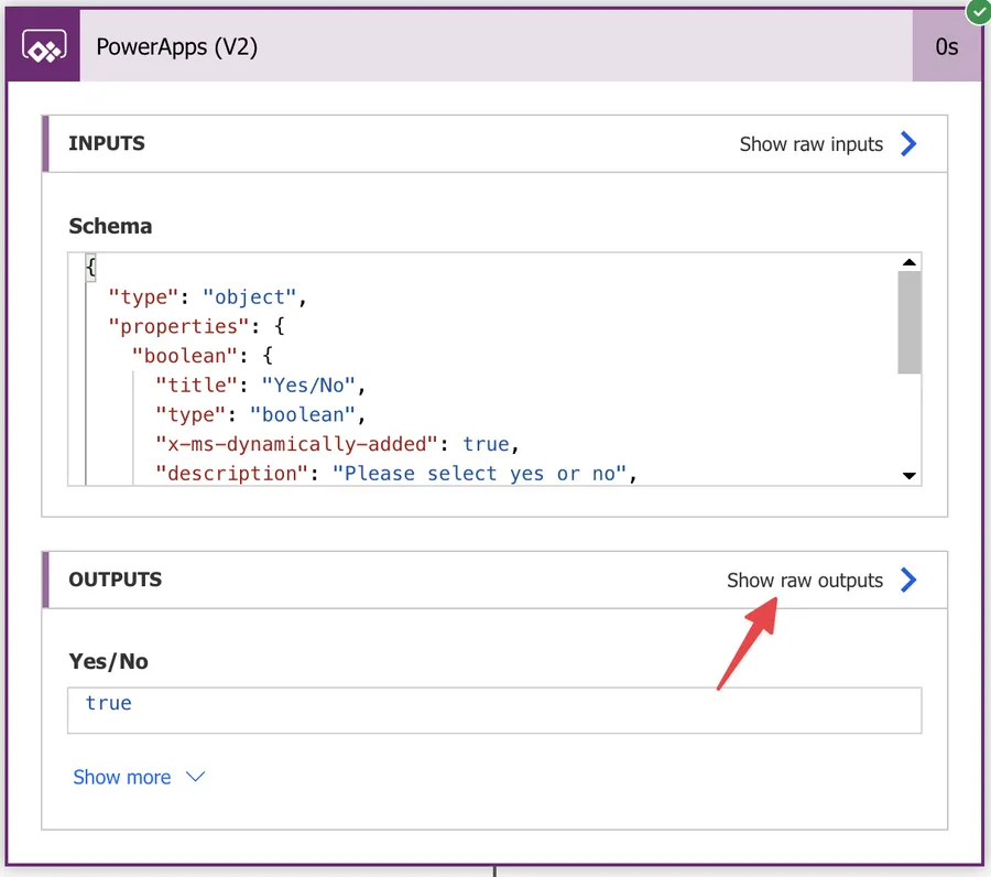 Looks good, but let’s double-check if the value that Power Apps returns us is correct. To do that, let’s press “Show raw outputs” in our "PowerApps (V2)" trigger, like this: