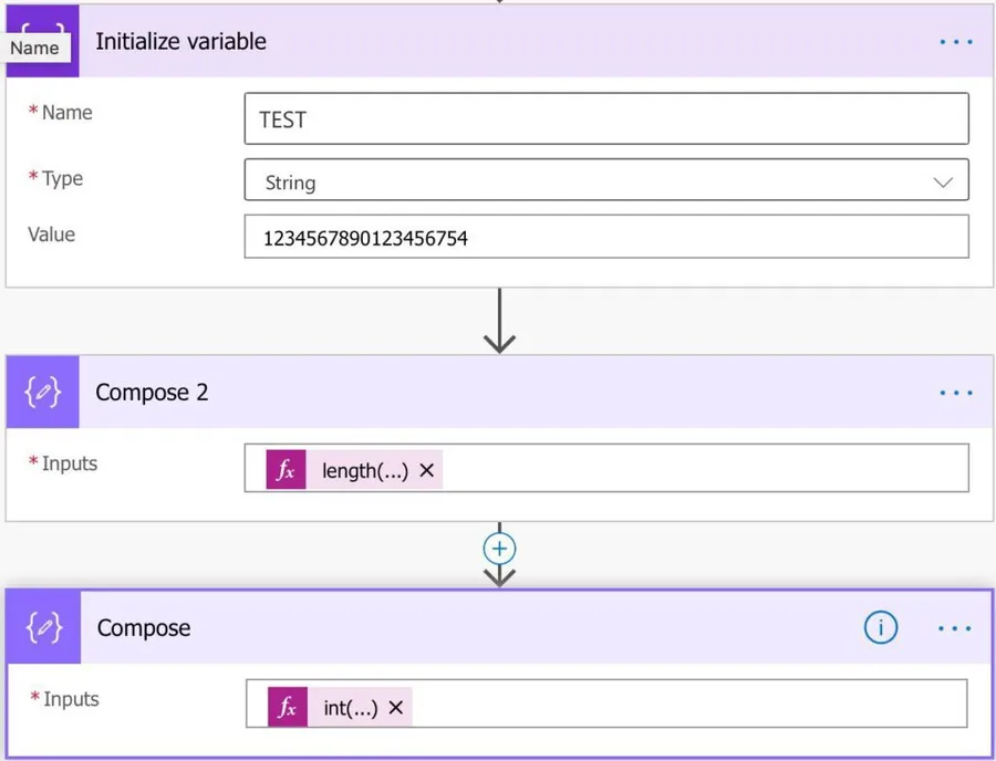 So even if your Power Automate doesn’t fail, you get an invalid conversion. It’s not what you want at all. You get a rounding and zeros instead of the digits that you defined. Strange, I know, but it's the expected behavior because the "int" type can only hold 16 numbers, but we would expect a different action, right? Failing after 16 and not allow three more digits while rounding them and adding zeros.