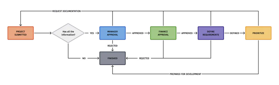First, let’s define a straightforward approval process for a development project idea that comes to the IT department to be developed.