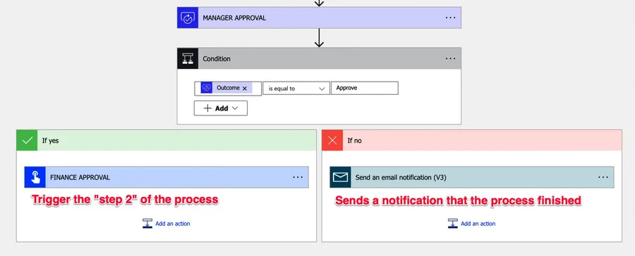 The overall process makes sense, but it has a huge issue. Since we’re waiting for people to do the actions, the Flow may take some time to run until the end. Remember that the Flow will stop on the “approval” action and wait for the answer. For example, if people book meetings to understand some parts of the process before approval, or simply because people are on holiday, a simple approval can take more than one week. Multiply with all actions, then you’re close to the 30 days limit, and the Flow will fail.