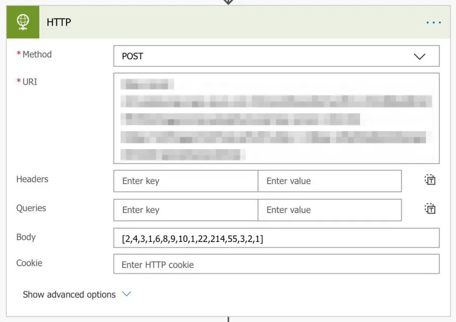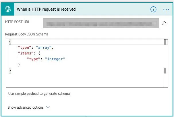 Anywhere in your Power Automate, you can call other Power Automates by using an HTTP Post. It can look quite technical, but once you get the hang of it, it’s quite simple. In this case, we just need to pass an array of numbers. An array is represented as [ ] and insert all the numbers as follows: