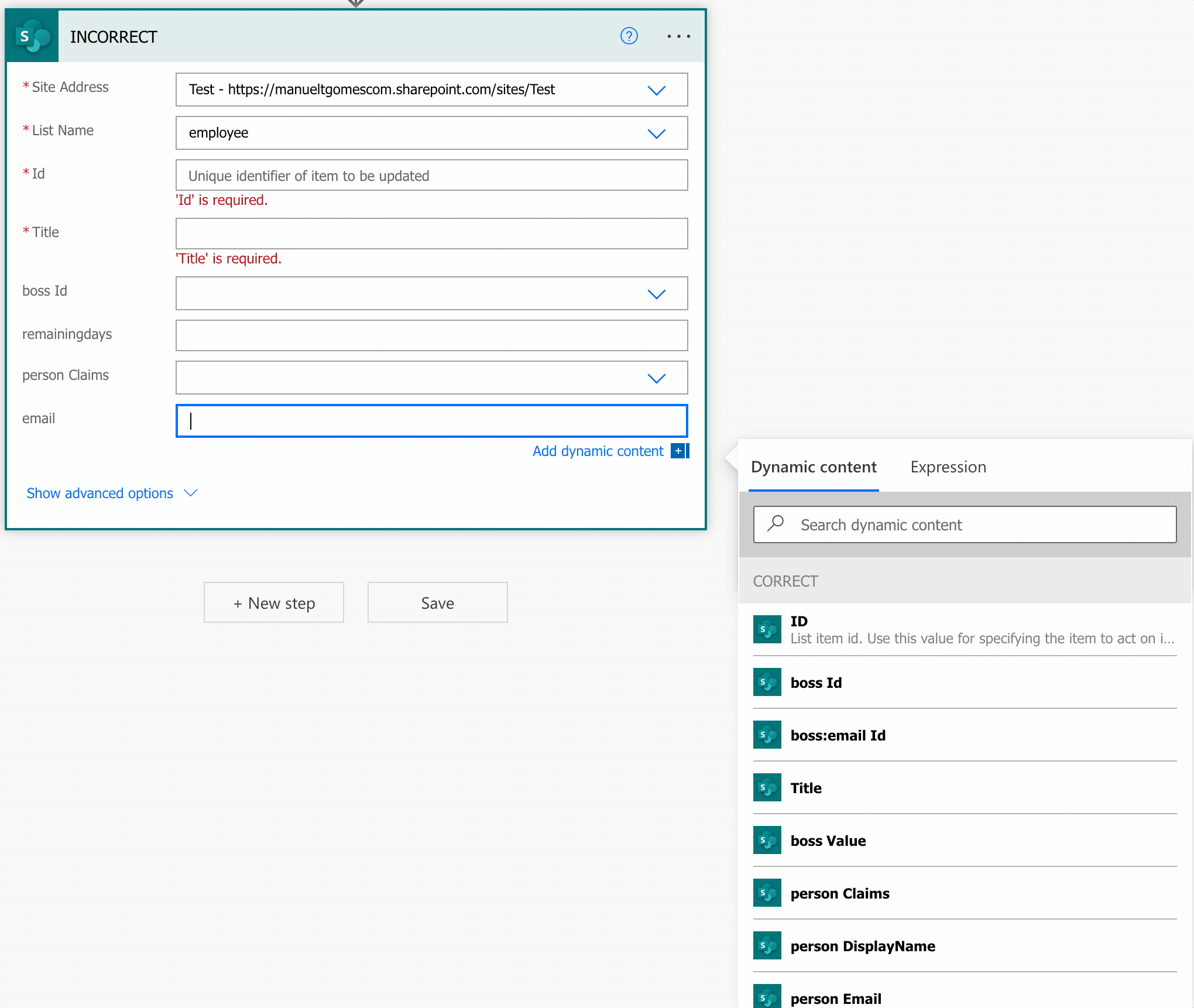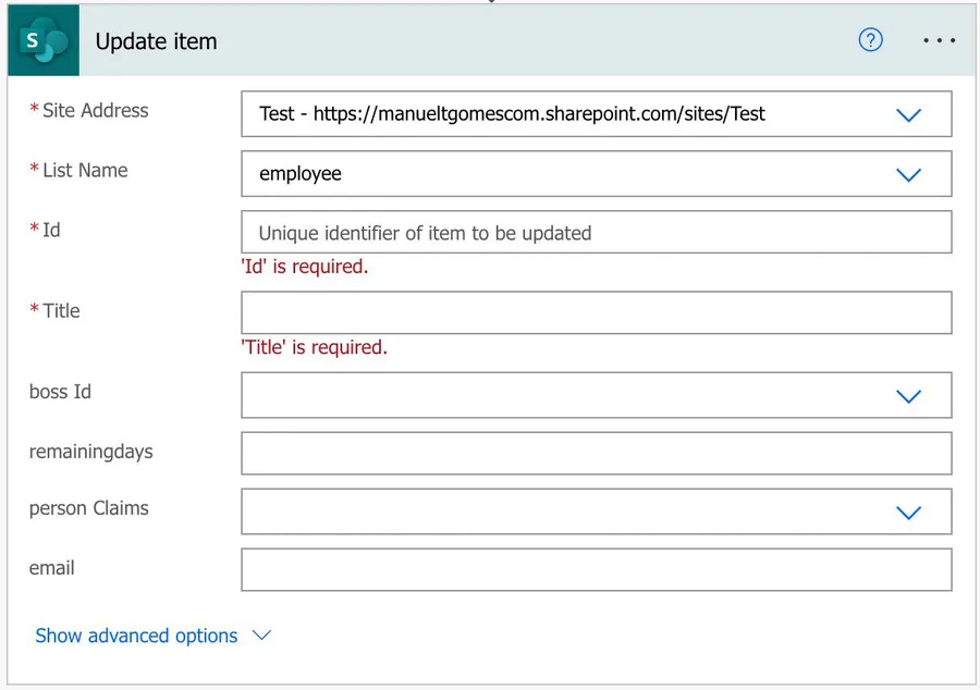 When you want to update data in SharePoint, you use the “Update item” action to do it, like: