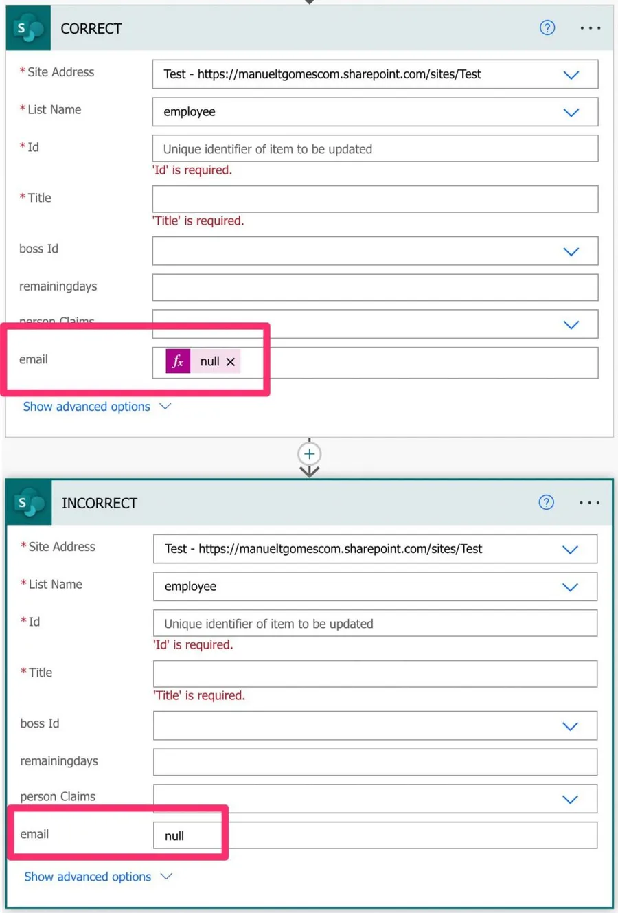 Notice that although both are spelled the same, they are entirely different. The first is the value of “null” while the second is a text that is “null.” So in the first case, SharePoint will replace the value with “nothing,” while in the second case, it will replace the existing value with the text “null.”