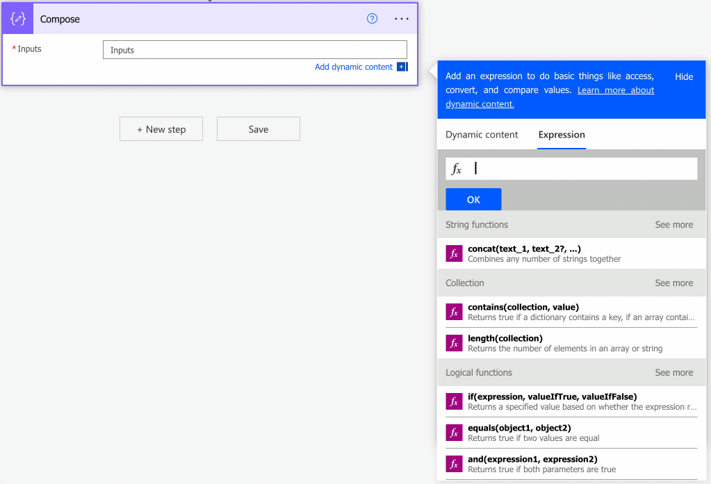 You can find the "variables" function in every action where a formula is supported. For example, let’s look at a “Compose” action: