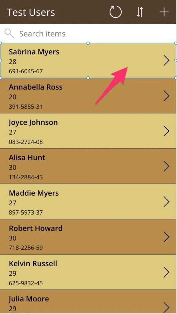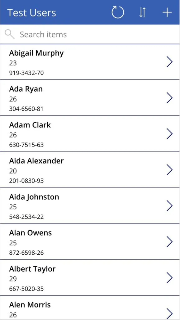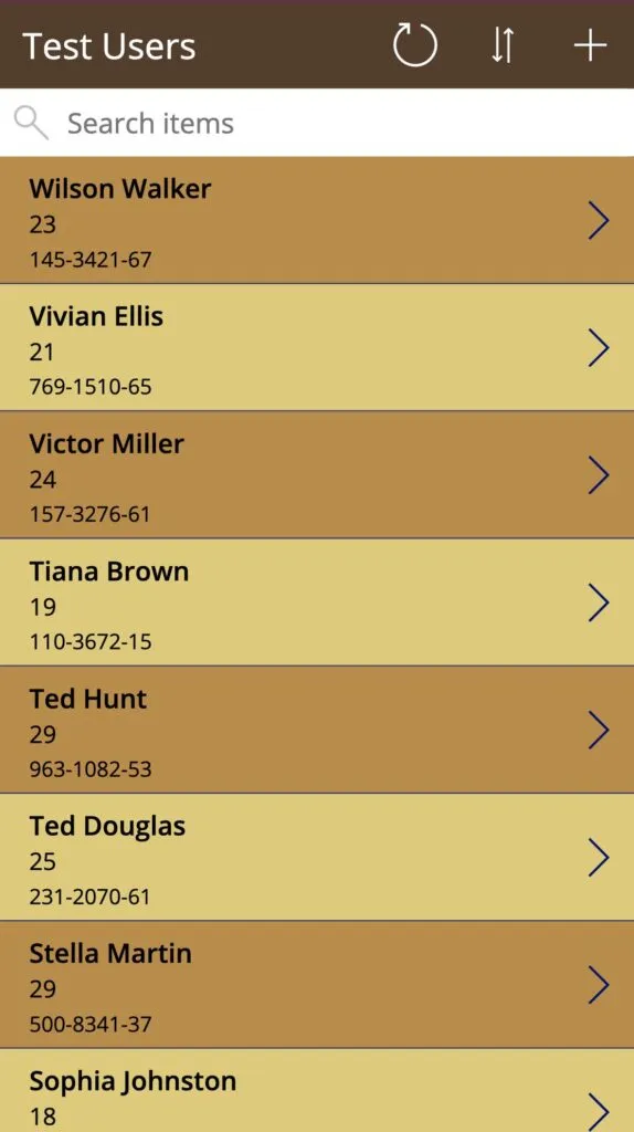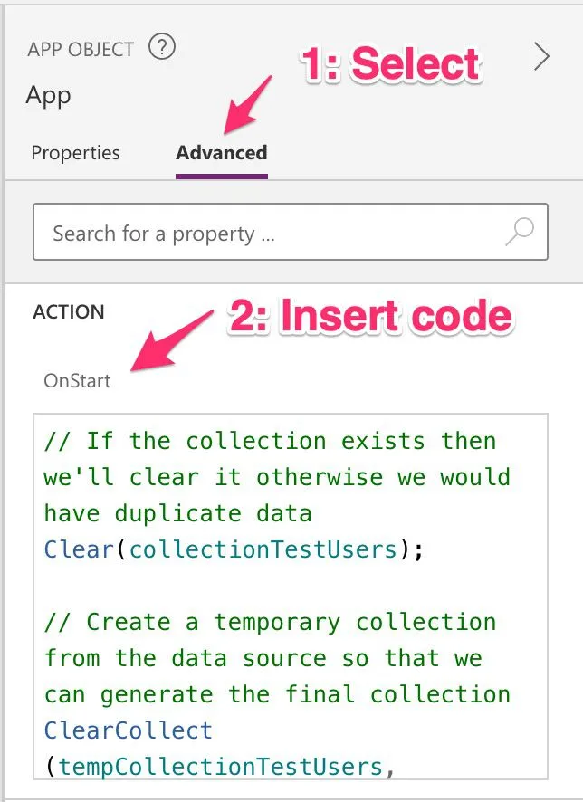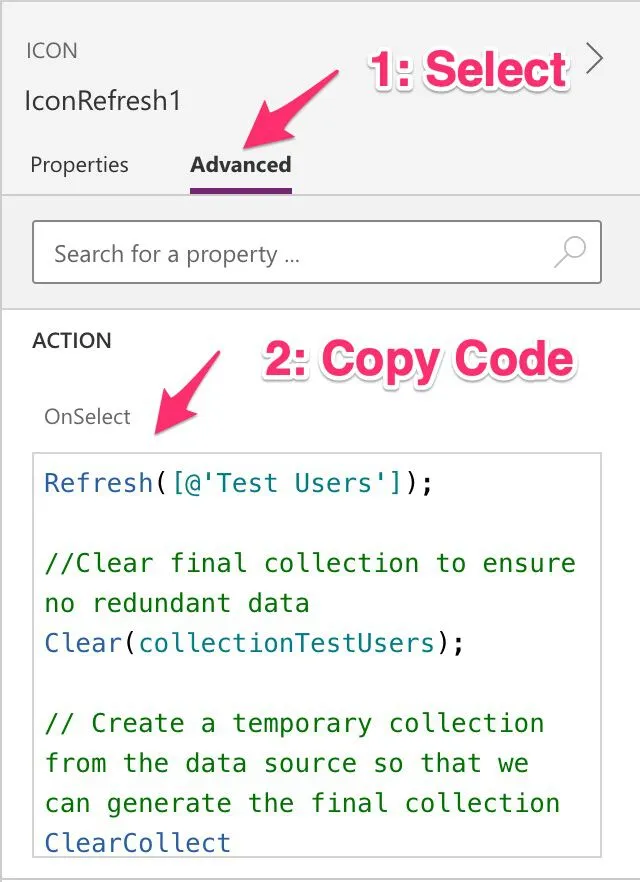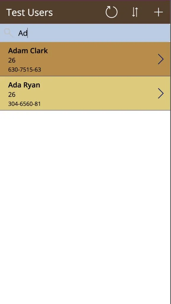 When we refresh the data, we want two things. First, to keep the filters and sorting direction and get the new data. We can use the code above with a small change. Instead of initializing the collectionTestUsers that has the data from our Test Users data source with the default values, we will add the same filter as in the Gallery. This way, we’ll ensure that the data is correct. Here’s the code: