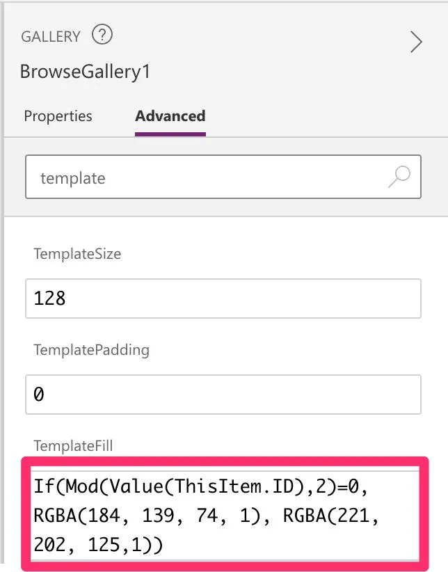 Search for “TemplateFill.” This property will define the background color of each cell.