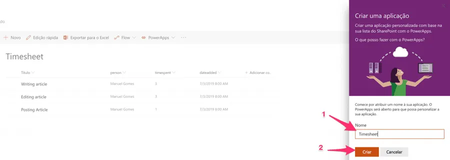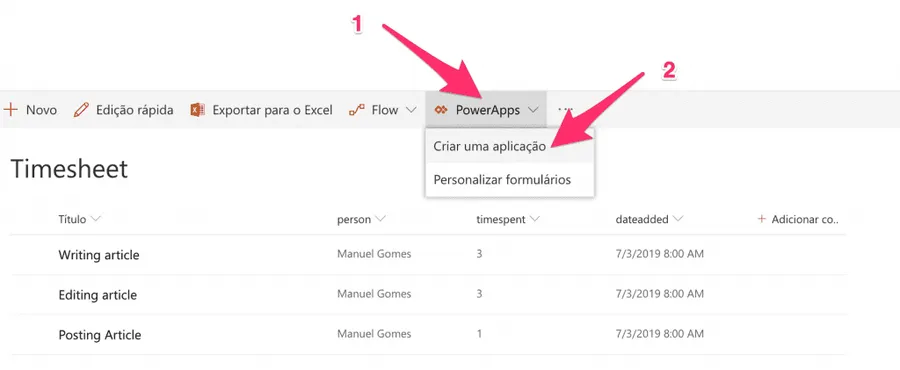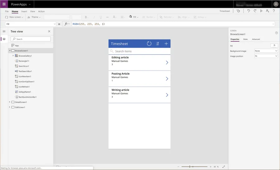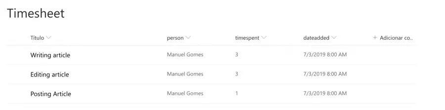 A more sustainable solution is to take full advantage of delegable functions. I have an article where I keep this information updated so you can check it out to see if the connector that you’re using (or thing of using) is delegable. Let’s build an app with this issue and prepare it for proper delegation. I’ll use SharePoint Lists as my data source, but you can use any other compatible data source. Let’s think about a simple timesheet app where each person inserts the time they spend each task.