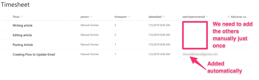 That’s where our friend Microsoft Flow shines! We can create a flow that looks at this list and performs actions every time a user creates adds an entry to the timesheet. But first let’s add a column to our list: