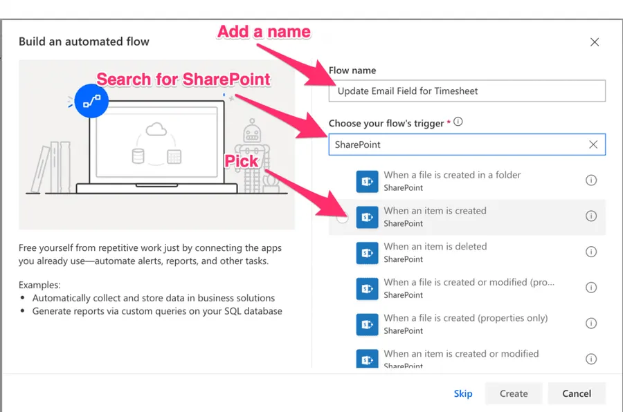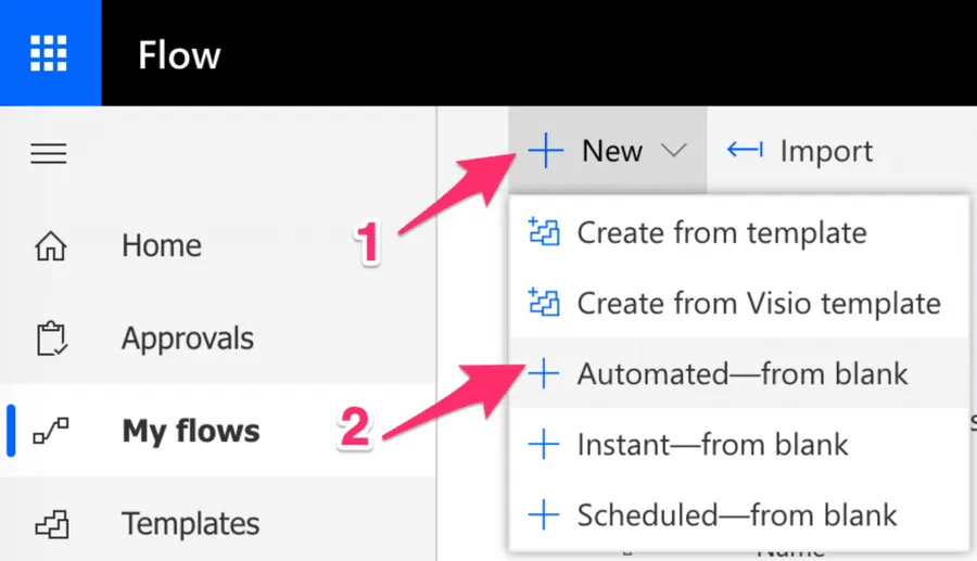 Now let’s create a flow to update the fields. Go to flow.microsoft.com and create a new automated flow: