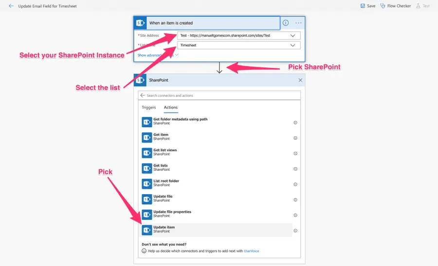 Now choose your SharePoint instance and list and add a SharePoint action to update the item.