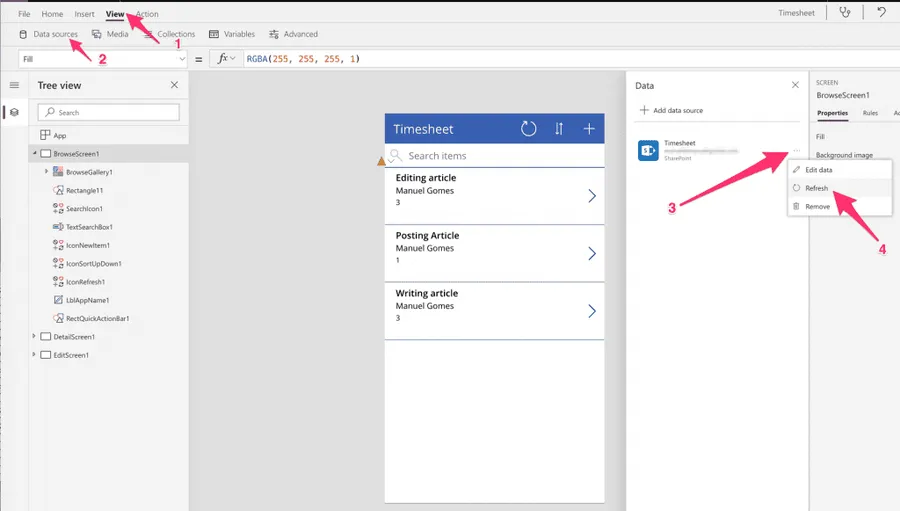 Since we changed the data source, we need to update PowerApps to fetch the changes. Just go to: