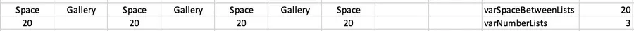 Set(varSpaceBetweenLists,20); Set(varNumberLists,3)