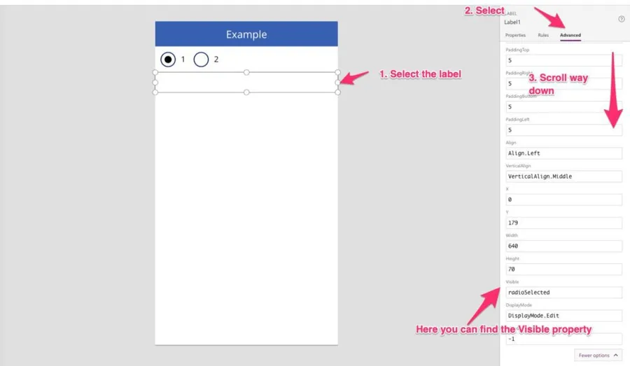 Now let’s show and hide the label. There's a property called “Visible” that accepts true or false.