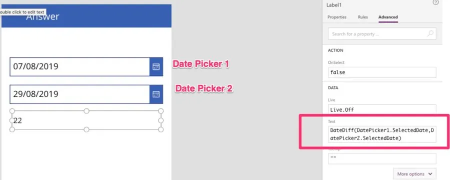 I want to show in this example that you don’t always need variables to achieve your objective. Here’s an example that calculates the difference between 2 dates. Any time one of them change, we calculate and update the property "Text".