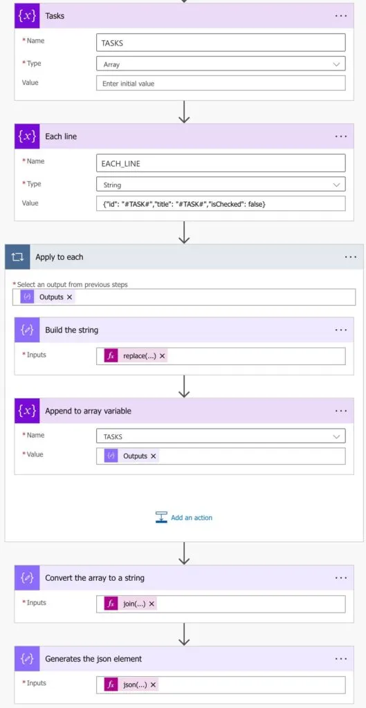 First, we create a new array variable to hold all generated items. To do that, we use the "Initialize variable" action. After that, we build the string with the structure that we need. Removing the information from above, we need: