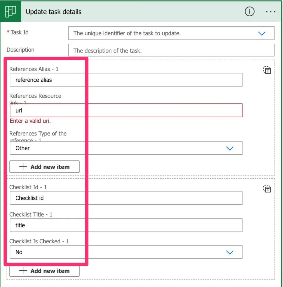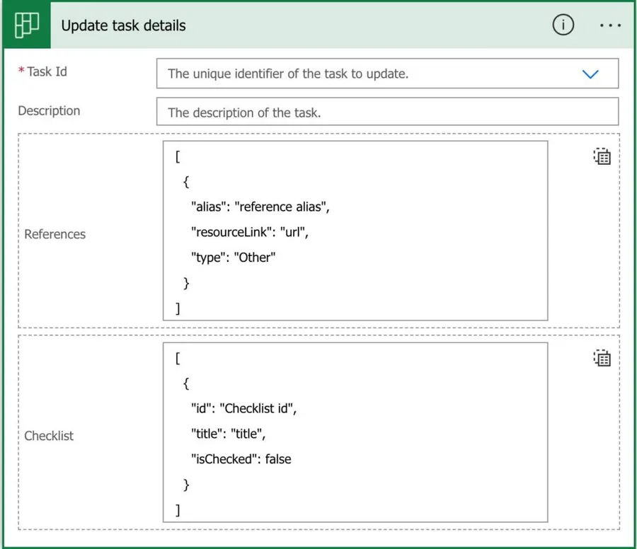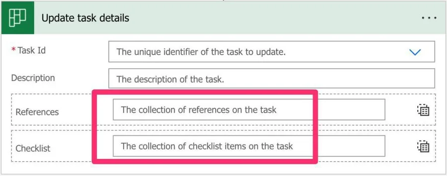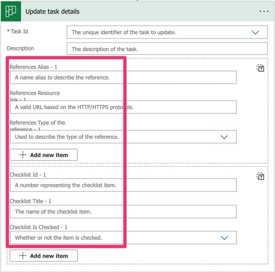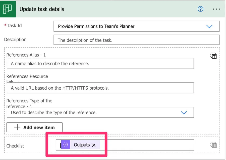 So first, we need to understand what we're going to target. For example, when you add a new reference or checklist to a task in Microsoft Planner, you can add the fields manually in the "Update task details" action.
