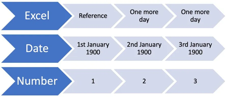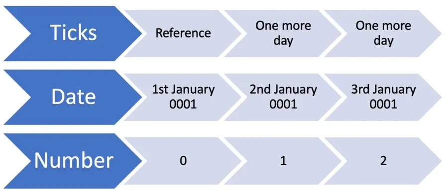 The last step is the one is that trips everyone. To understand that, we need to understand how ticks work. They count the number of days since the reference day. So the 2nd January 0001 is 1 since it’s one day elapsed. Excel does the same thing, but the 2nd January 1900 is the day (the next day after the reference) returns 2 since the first day is 1.