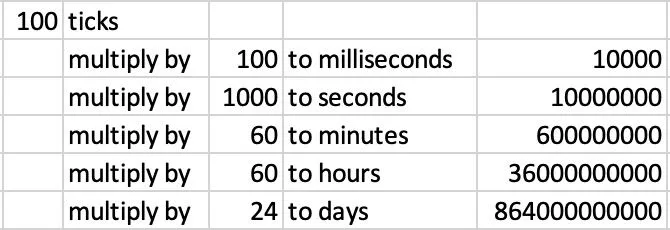 We’re almost there! Now we need to convert ticks (nanoseconds) to days. To do that, here’s the formula: