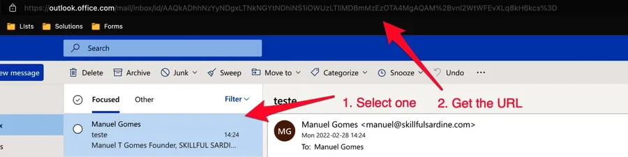 The first part is the URL to Office 365 Office inbox. The URL is quite descriptive and indicates everything that we need to know. We want the item in the inbox with an ID.