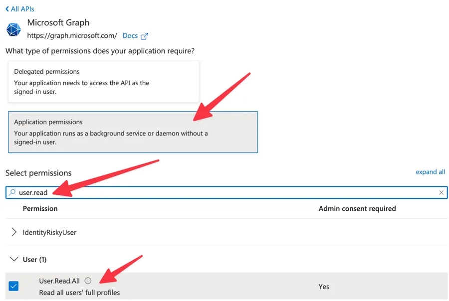 - Select the permissions you need. In our example, we want to list users, so we’ll select “User.Read”