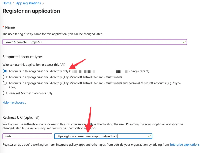 - Name: Choose a descriptive name (e.g., "PowerAutomate-GraphAPI-Integration")