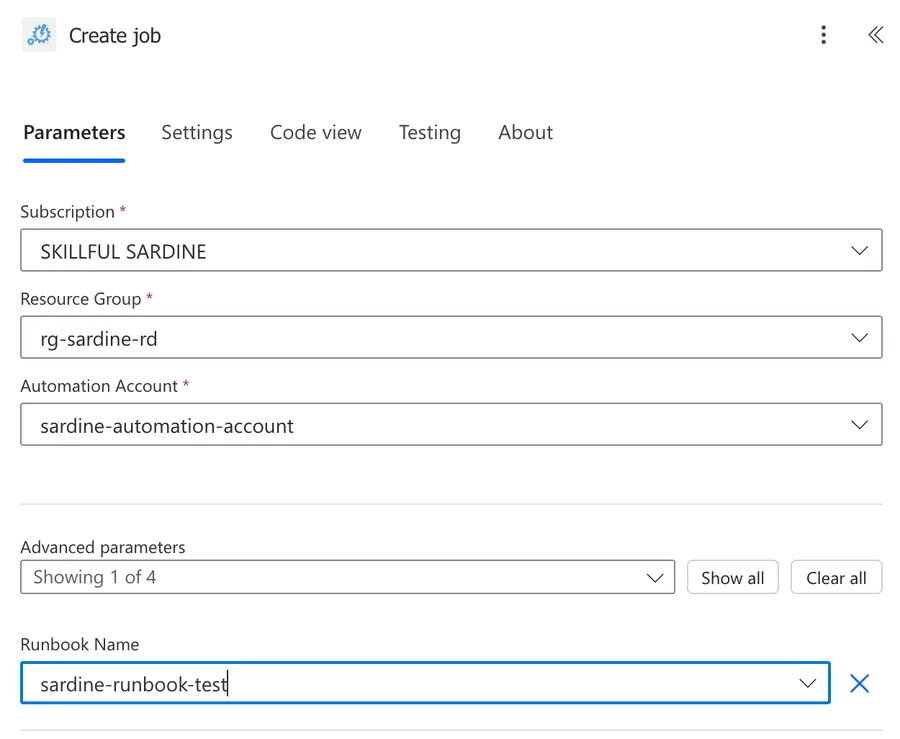 - Select your Automation Account and Runbook. Since we defined them before, all the parameters should look familiar, but don't forget to adjust to the ones that make sense to you.