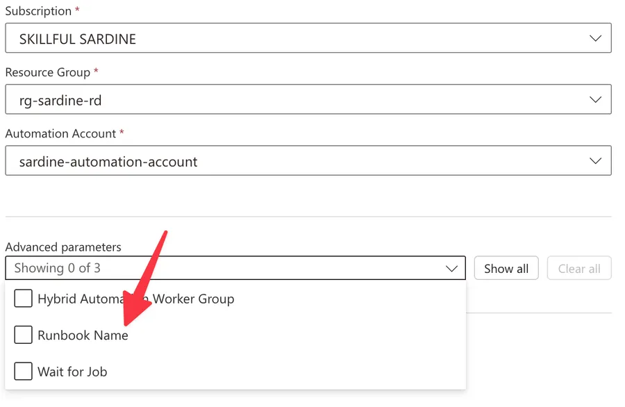 - Notice that our "runbook" requires a name, so we must also configure that. Since this is specific to that "runbook", it will only show after you select it.
