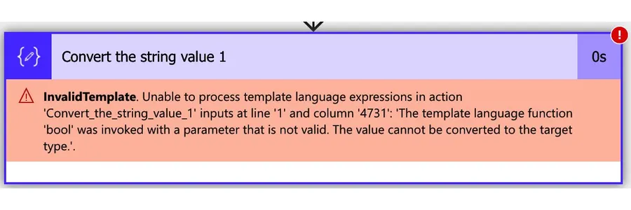 Unable to process template language expressions in action 'Convert_the_string_value_1' inputs at line '1' and column '4731': 'The template language function 'bool' was invoked with a parameter that is not valid. The value cannot be converted to the target type.'.