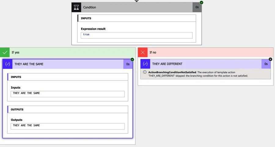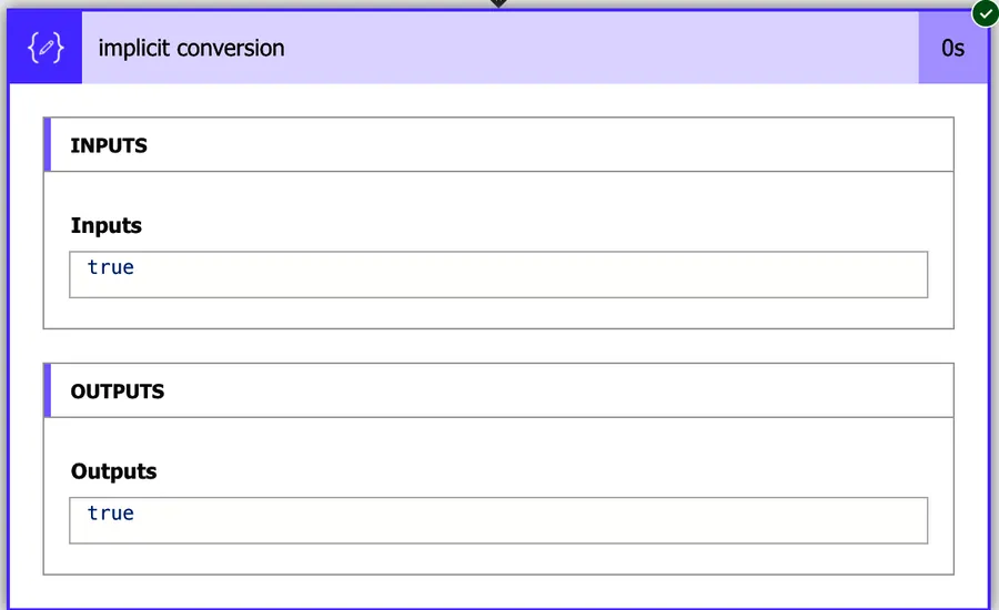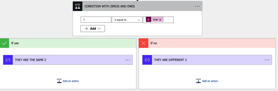 This result shows that Power Automate understands what "1" is in boolean, although in the case of the expression it cannot be converted. In the comparison, the "1" is considered the number "1" and not the "boolean value" for true. In the case of the conversion, it doesn't matter. Both are converted correctly.