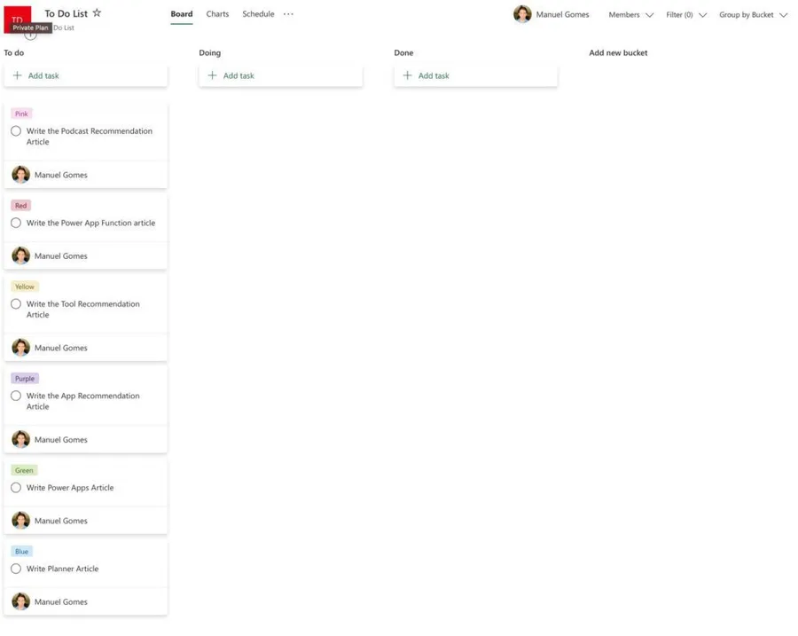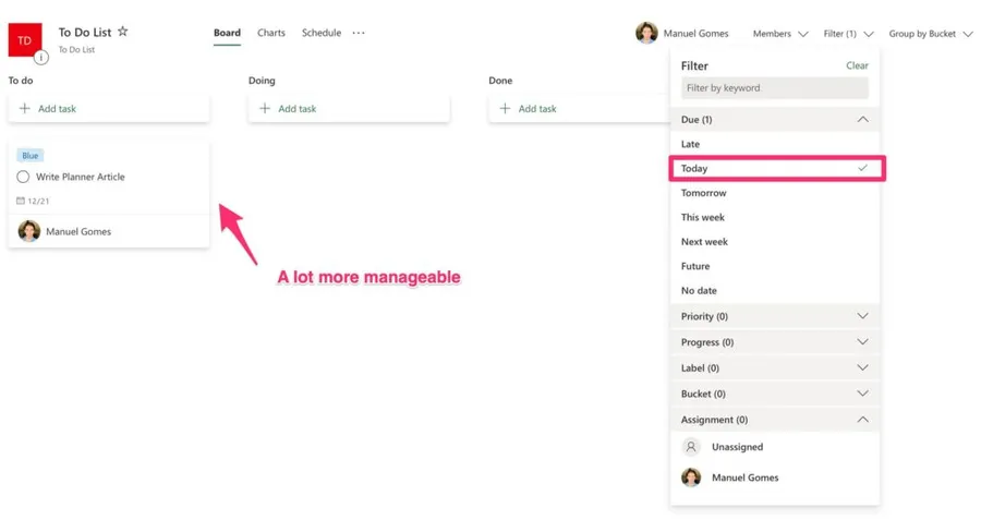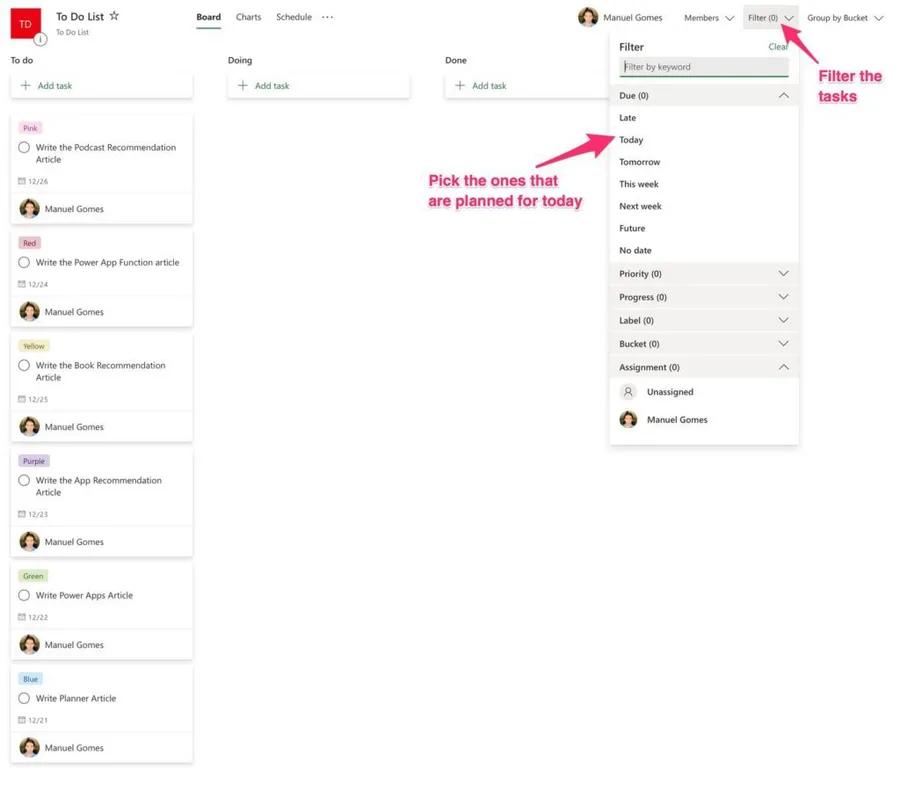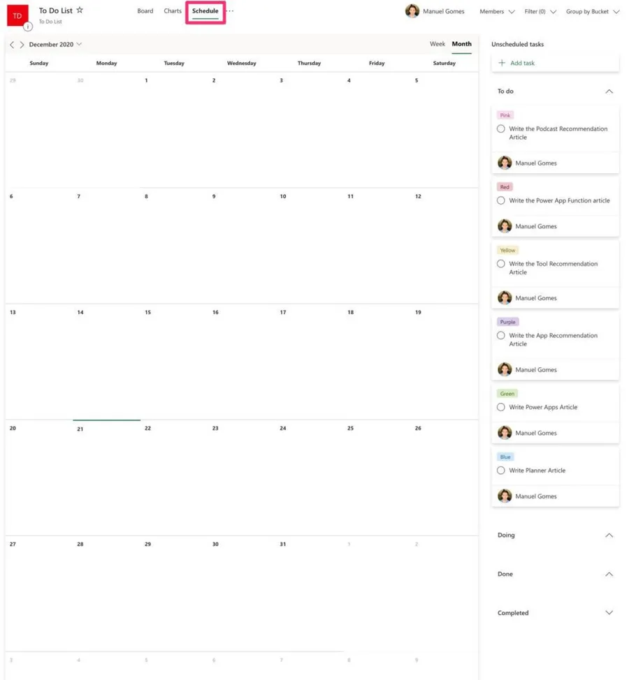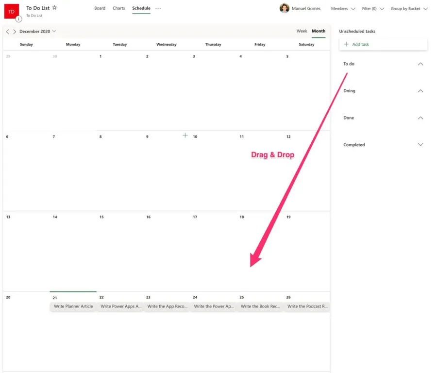 Microsoft Planner’s schedule view can help with this. It displays the list of tasks that you have to do to drag them to your calendar and have a “bird's eye view” of what you need to do each day and what the tasks are that you need to do. It also allows you to understand if any day is too busy and shift the tasks around.