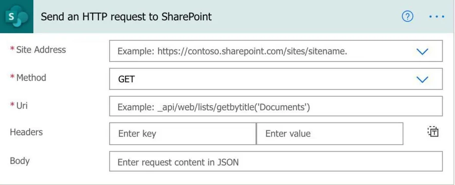 We’re going “into the weeds” a bit here with this, but it’s important to understand what we’re doing. We’re defining an HTTP request that will send to SharePoint’s API. All other SharePoint actions do this, but they “abstract” the most technical stuff from us. Since we want to do something more specific, we need to do the request ourselves.