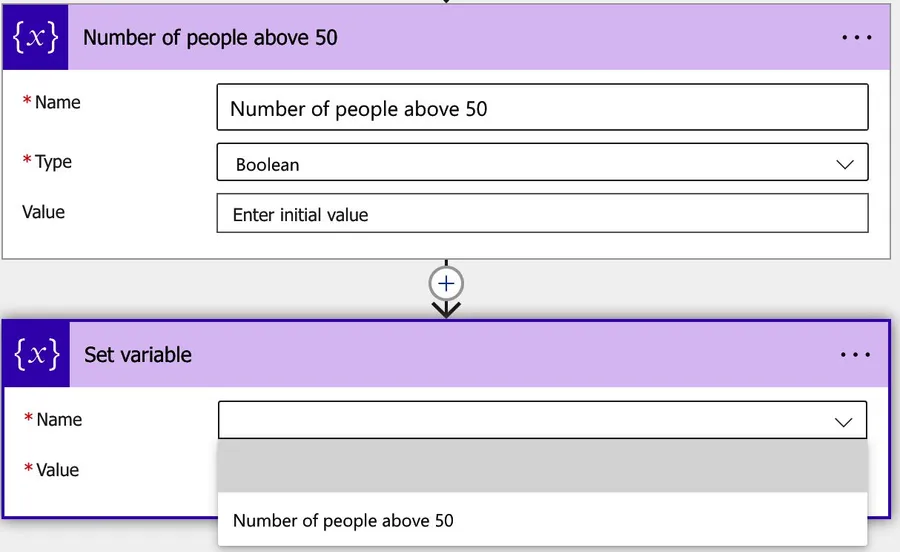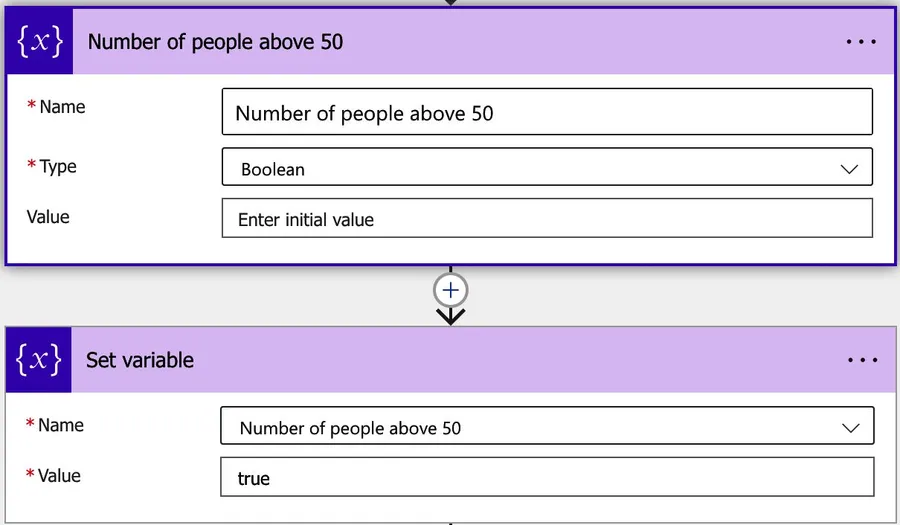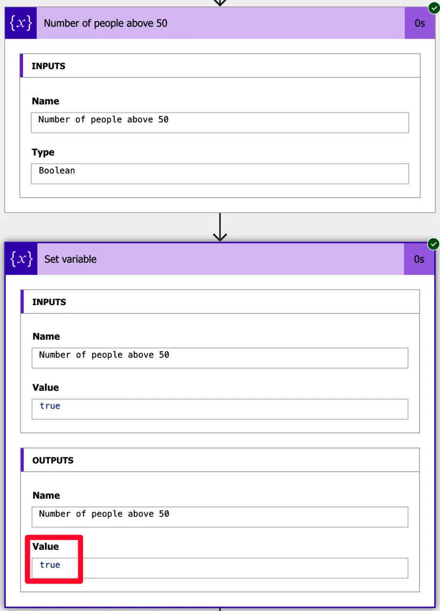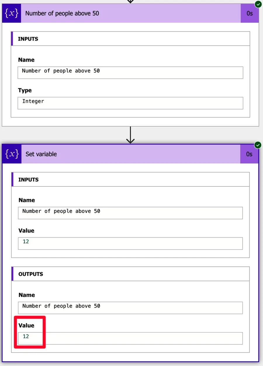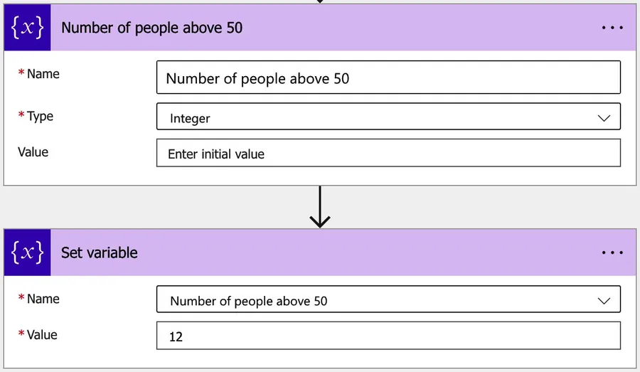 It's essential to name the "set variable" action correctly because we need to understand why we're doing it. For example, having "Set the number of people above 50 with the calculation result" will tell you a lot of information, even without expanding the action. This will make a massive difference for complex Flows when you're trying to debug something.