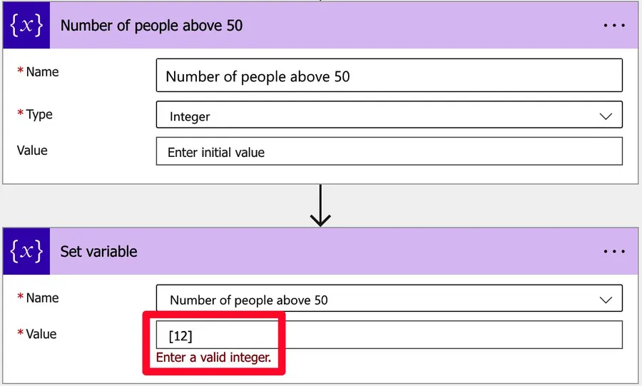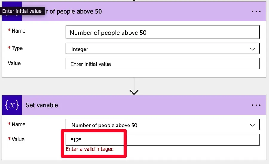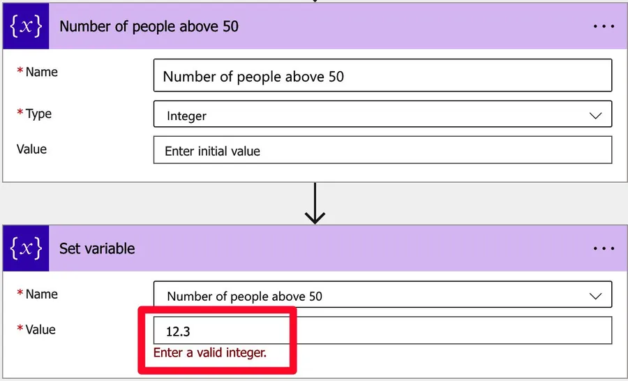 Please note that this validation will only be performed if Power Automate determines the value type. So, for example, if you use the value of another variable, Power Automate can understand that the other variable is for a specific type and evaluate it. But if you're using something else, like a "Get item" from a SharePoint list, then Power Automate will only validate the value once it's running.