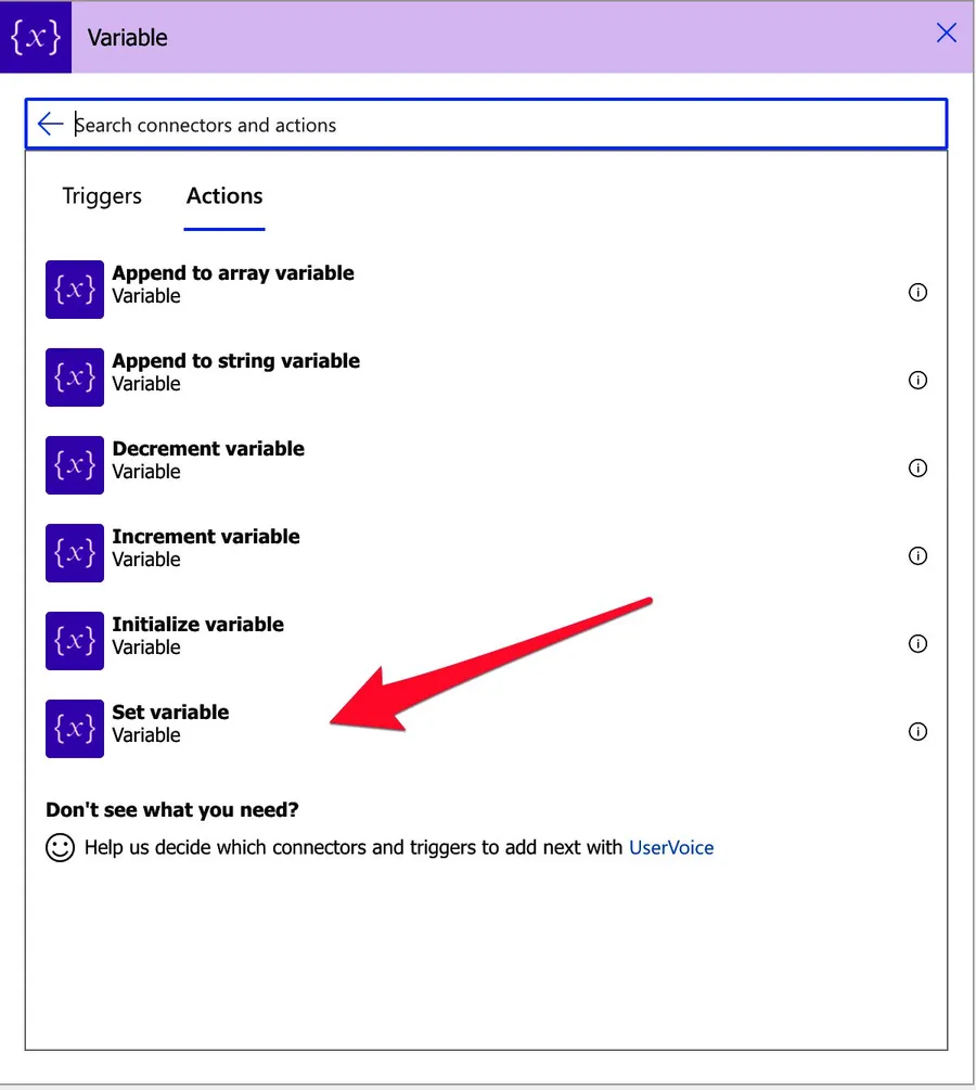 To use the "set variable" action, you first need to use the "Initialize variable" action to create a variable. After that, you'll see it in the dropdown by the name you defined.