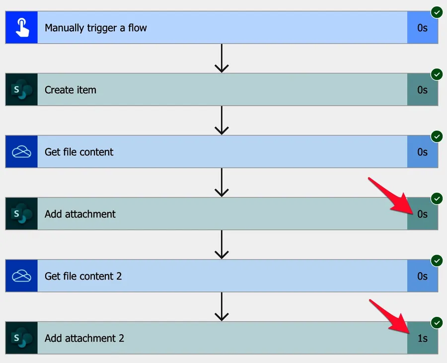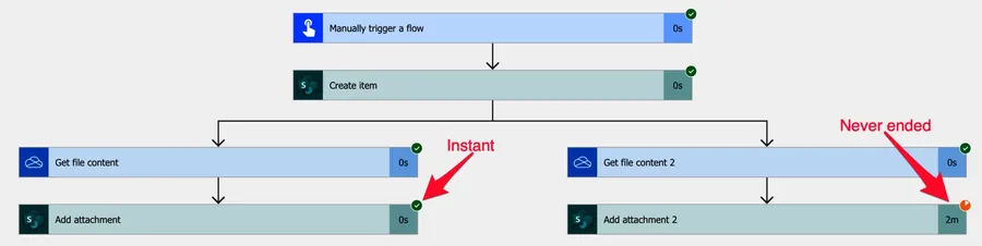 You should limit concurrency while using the "add attachment" action. For example, if you're adding multiple files at the same time, do it sequentially; otherwise, you'll have Flows that don't stop, like this: