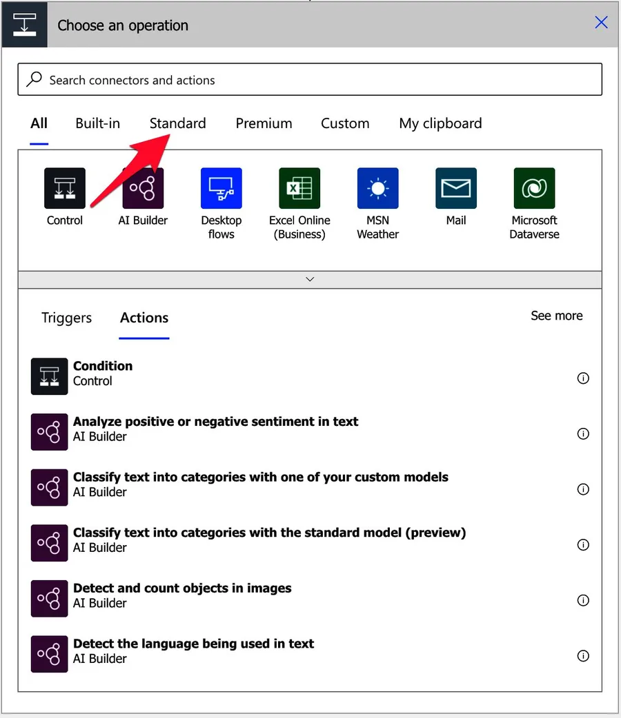 [su_panel text_align="center" background="#e3f4f9" color="#135165" border="1px solid #18799d" shadow="0px 3px 10px rgba(0, 0, 0, 0.25)"]Pro Tip: Power Automate tends to save the most common actions in the main screen, so check there before going trough the full hierarchy. Also you can use the search to quickly find it. [/su_panel]