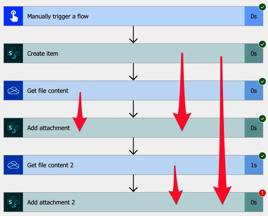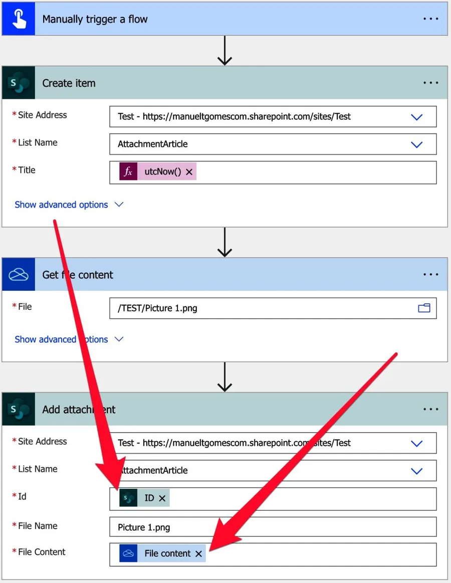 Hi Manuel, I am actually trying to put items from the document library into the attachment column in my Sharepoint list. For example, a file from a client that was uploaded to onedrive will first up copied a sharepoint folder. then is to be added to the client's row in my sharepoint list based on if the attachment file contains "client name" then it is automatically added to that row. i tried to reverse engineer this based off of your post. but i can't the part to work that cross references the client name in the list with the name of the file. i use the get items action with filter expression: contains(body('Get_items')?['value'], 'First Name') and then it fails with: Flow save failed with code 'InvalidTemplate' and message 'The template validation failed: 'The 'inputs' property of template action 'Get_items' at line '1' and column '2221' is not valid. The action cannot reference itself.'.'. any change you can point me in the right direction?