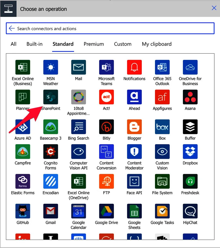 You can find the "add attachment" action in the SharePoint section. Select "Standard":