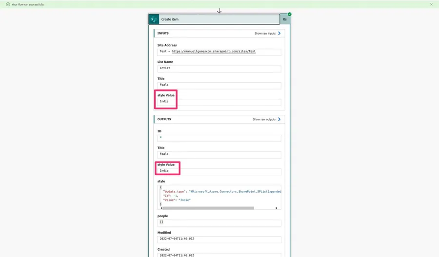 Finally, you can only insert one value each time. If you’re inserting many values, your Flow may take some time to finalize since you have to call SharePoint for each action run.