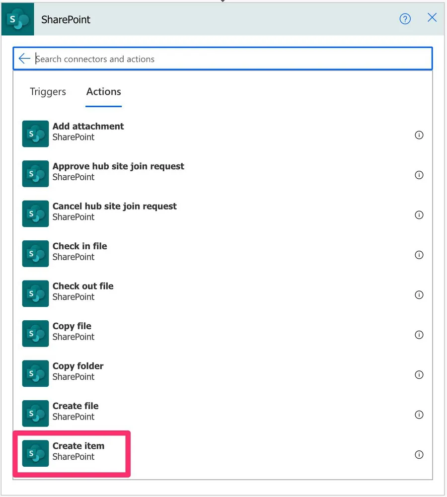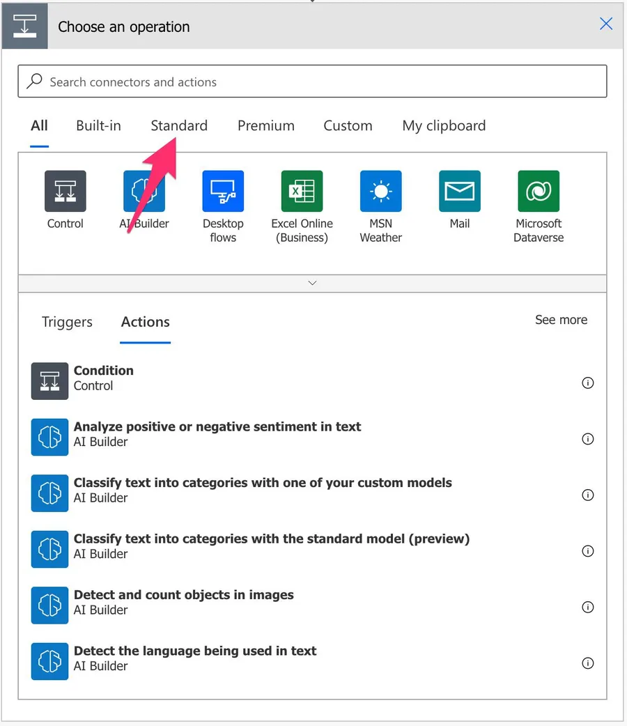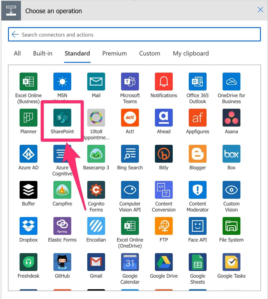You can find the “create item” action in the SharePoint section. Select “Standard”:
