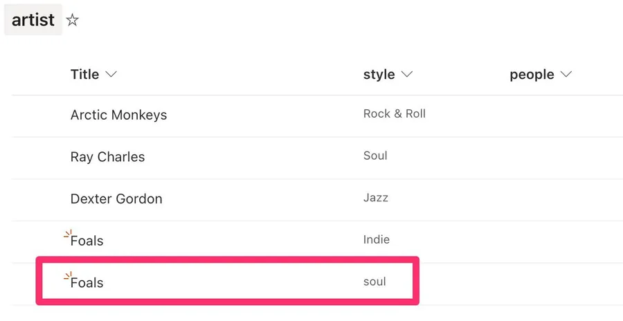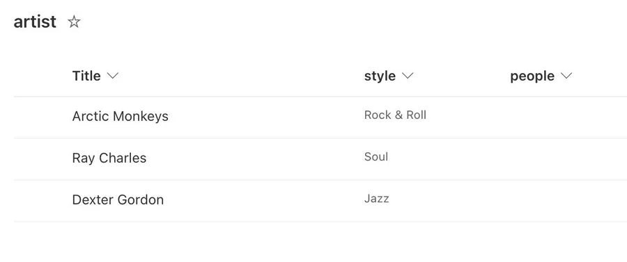 Let’s start with a simple list containing an artist, its musical style, and an optional field having the people who associate with them.