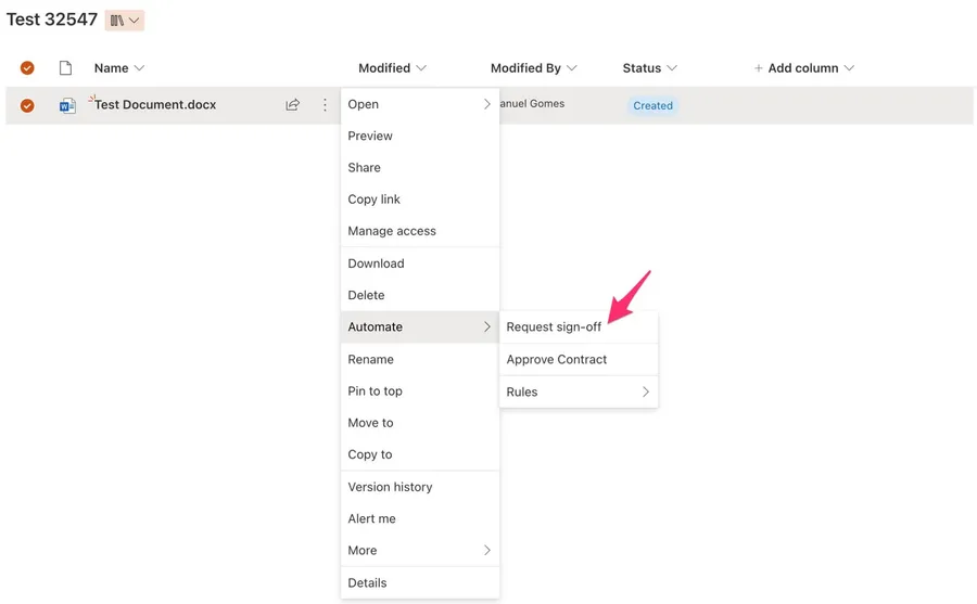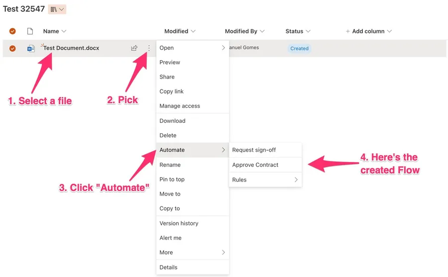 Now that we have a Flow with SharePoint “For a selected” trigger, let’s go to the SharePoint document library and see how to trigger the automation.