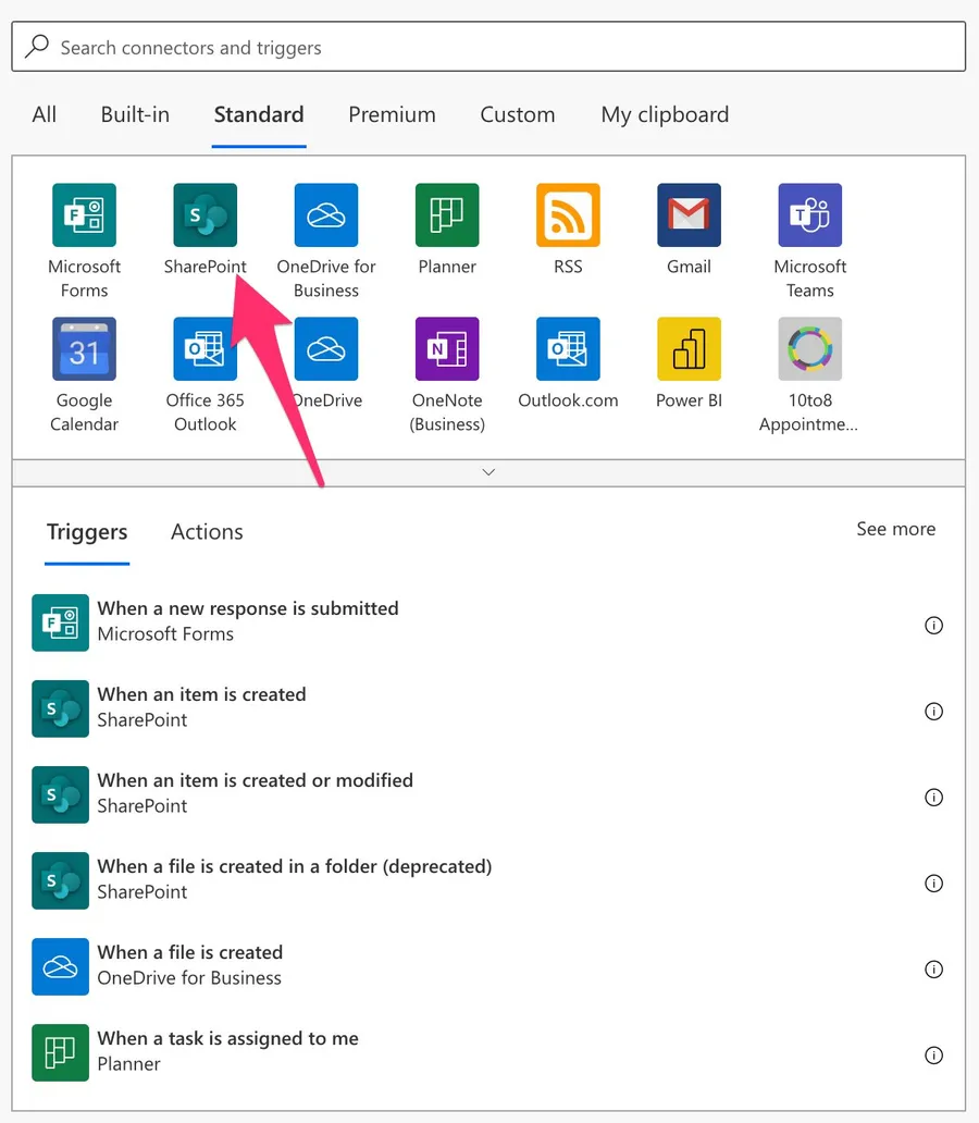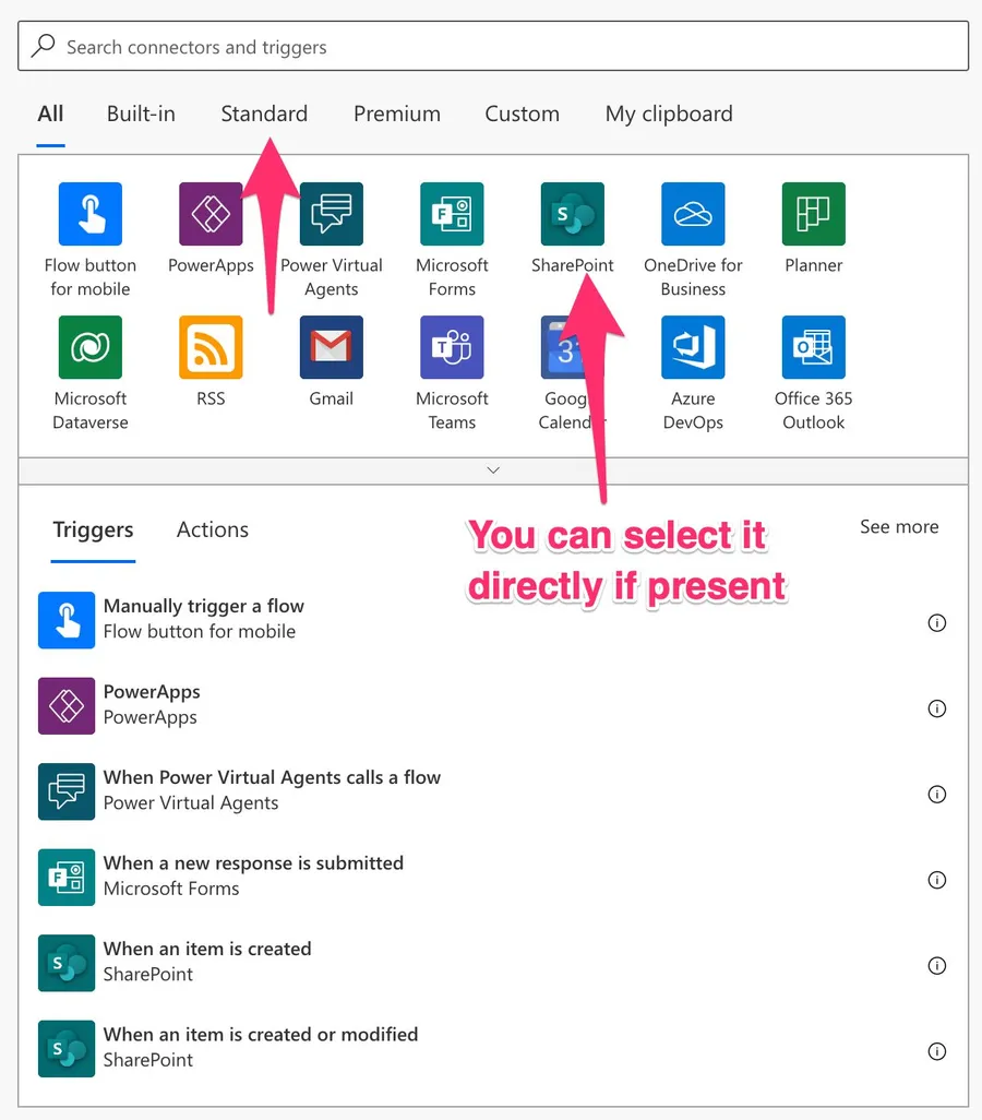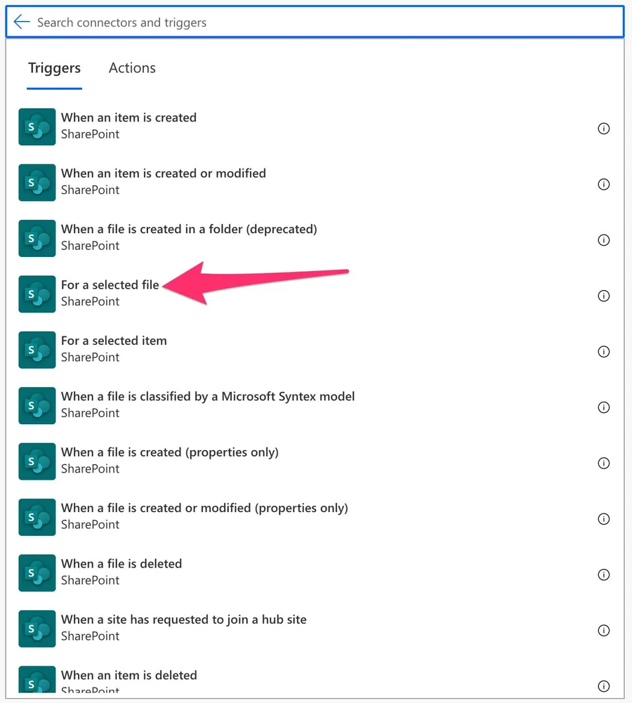 To find it, you can search for SharePoint “For a selected file” trigger or select “Standard”: