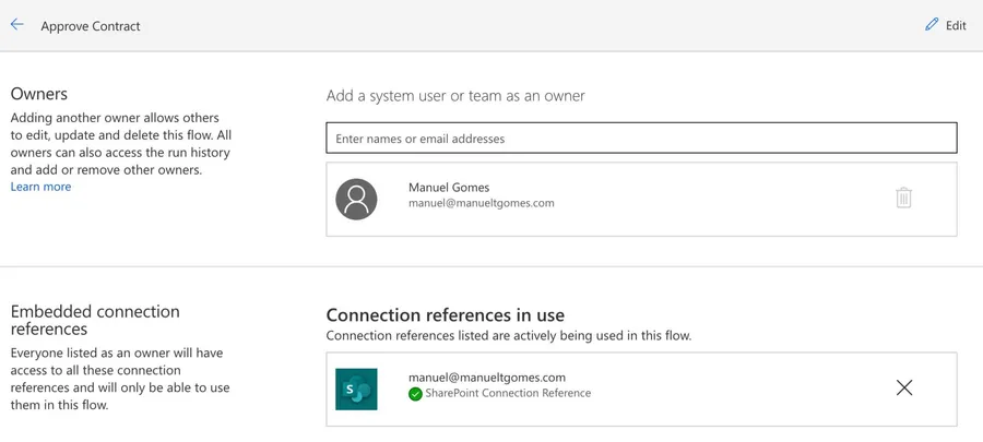 If you build the Flows in the “My Flows” section, only you will see them in SharePoint. This is not a limitation per se, but it’s something that you should be aware of. If you want other users to see the Flow, you need to share it with them like this:
