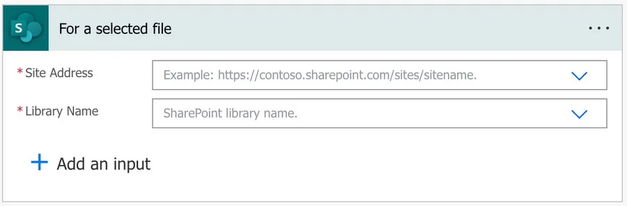Notice that we only got the information about the file, not the file itself. Other triggers like SharePoint’s “When a file is created (properties only)” trigger, for example, will return the file metadata that we can use, but the SharePoint “For a selected file” will return the item ID. We can then use that ID and use the “Get File Metadata Action” action to get the file metadata for the file to parse.