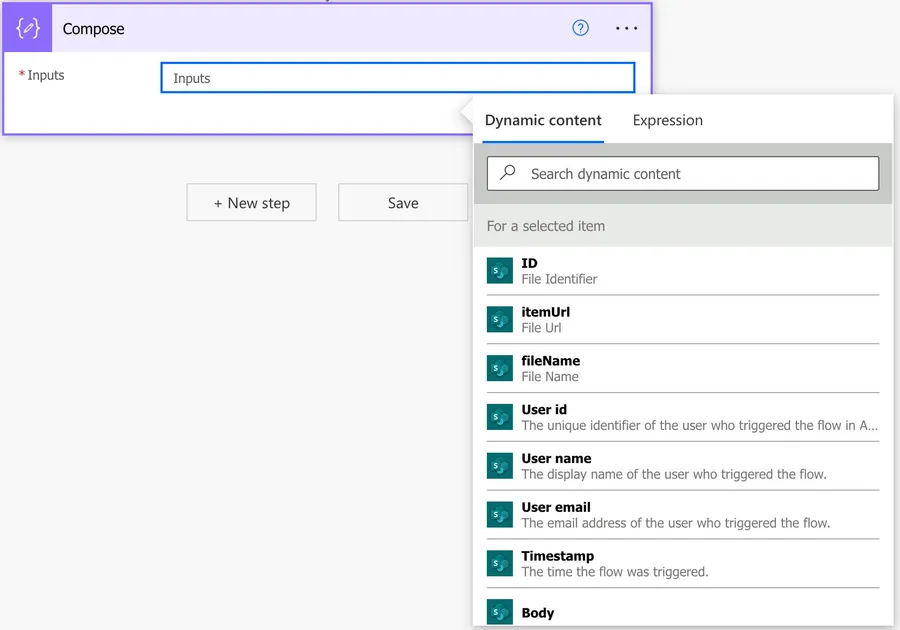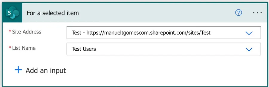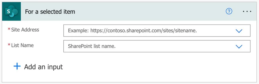 Notice that we only got the information about the item, not the item itself. If you’re used to using the “When an item is created” trigger that returns all the information about the “item,” you’ll notice that the “For a selected item” trigger only returns the identification of the item and not much more. To get all the item’s details, you need to use SharePoint’s “Get item” action.
