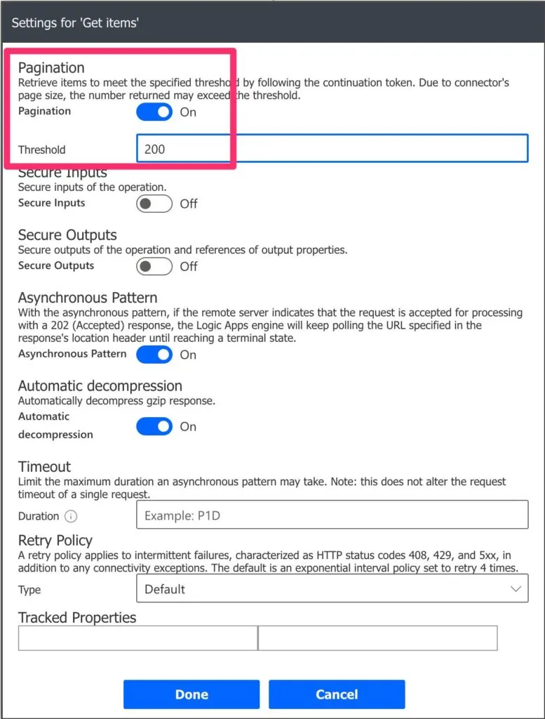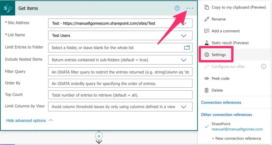 As mentioned before, the “get items” action only returns the first 100 elements. You can increase this limit, but I would advise that you do it with care and knowing the impact. To do it, go to “Settings.”